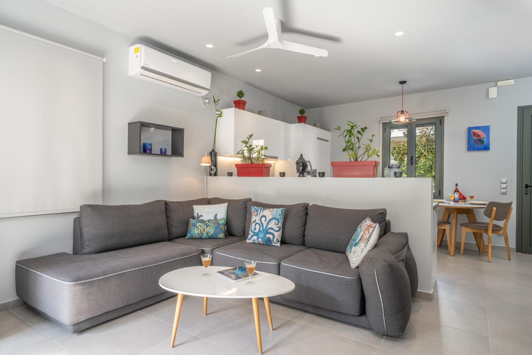 LIVING/ DINING AREA: Comfortable living room, dining table, flat screen TV, sofa.